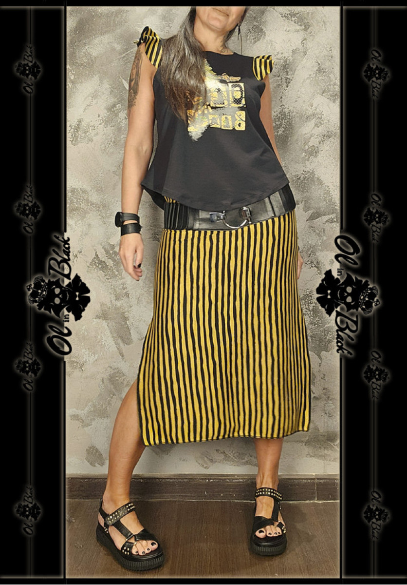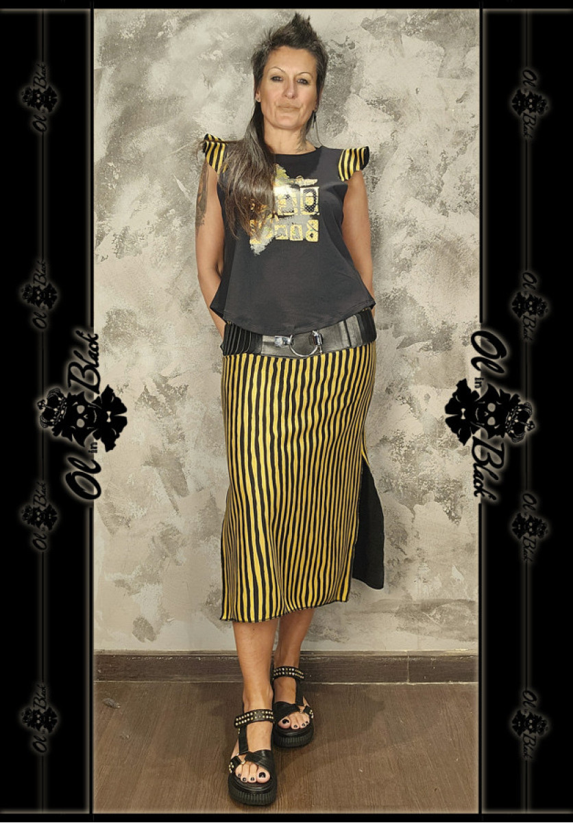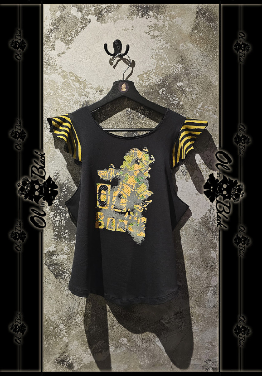 CAMISETA CON VOLANTES AMARILLOS Y GRÁFICO ABSTRACTO.