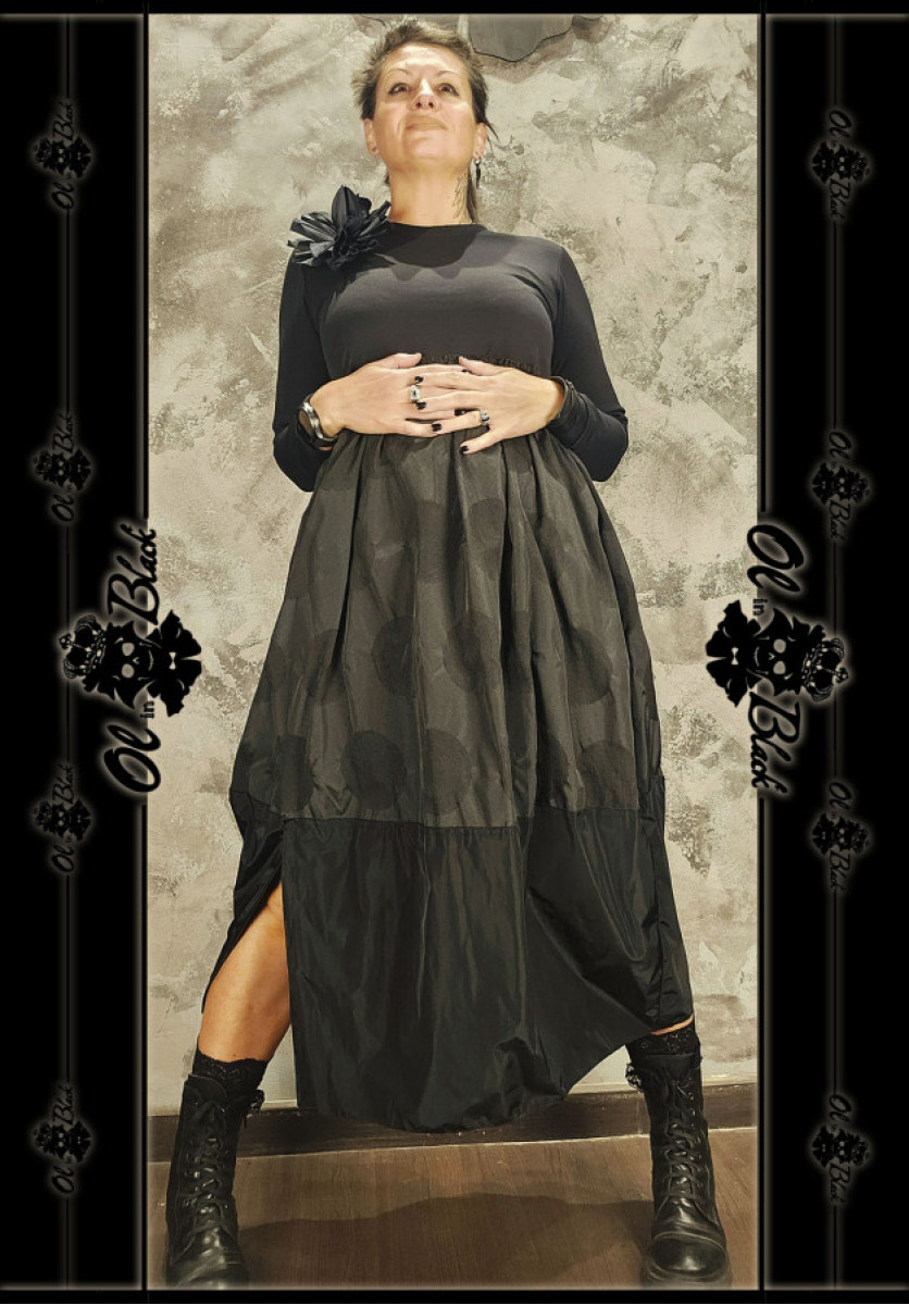 VESTIDO LARGO ELEGANTE CON MANGA LARGA Y VARIOS TEJIDOS.