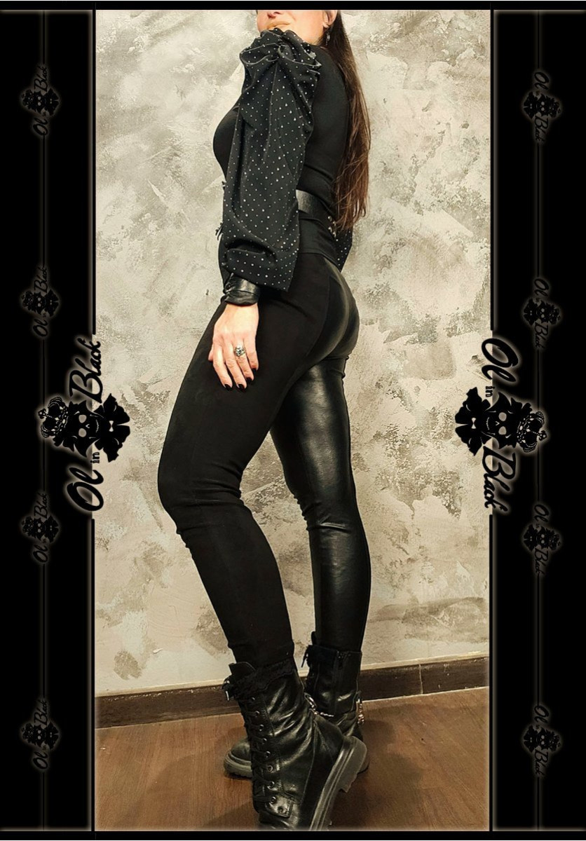 CAMISETA NEGRA DE MANGA LARGA, VOLANTE EN HOMBRO CON STRASS. TU.
