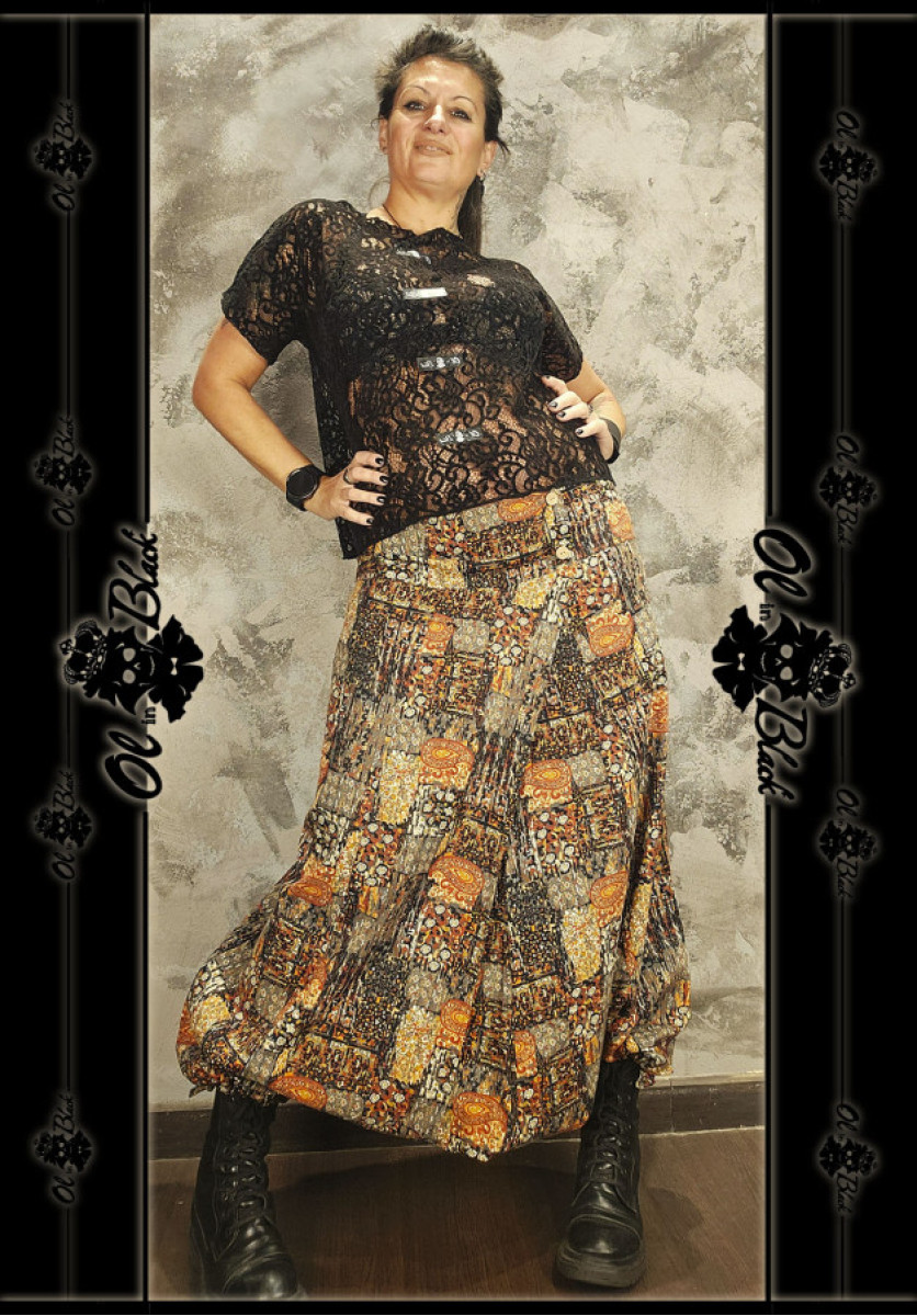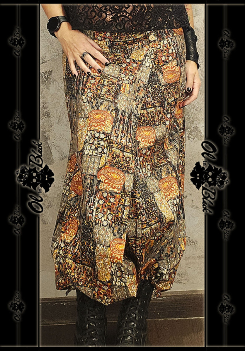 PANTALÓN BOHEMIO TIRO BAJO ESTAMPADO EN TONOS CÁLIDOS.